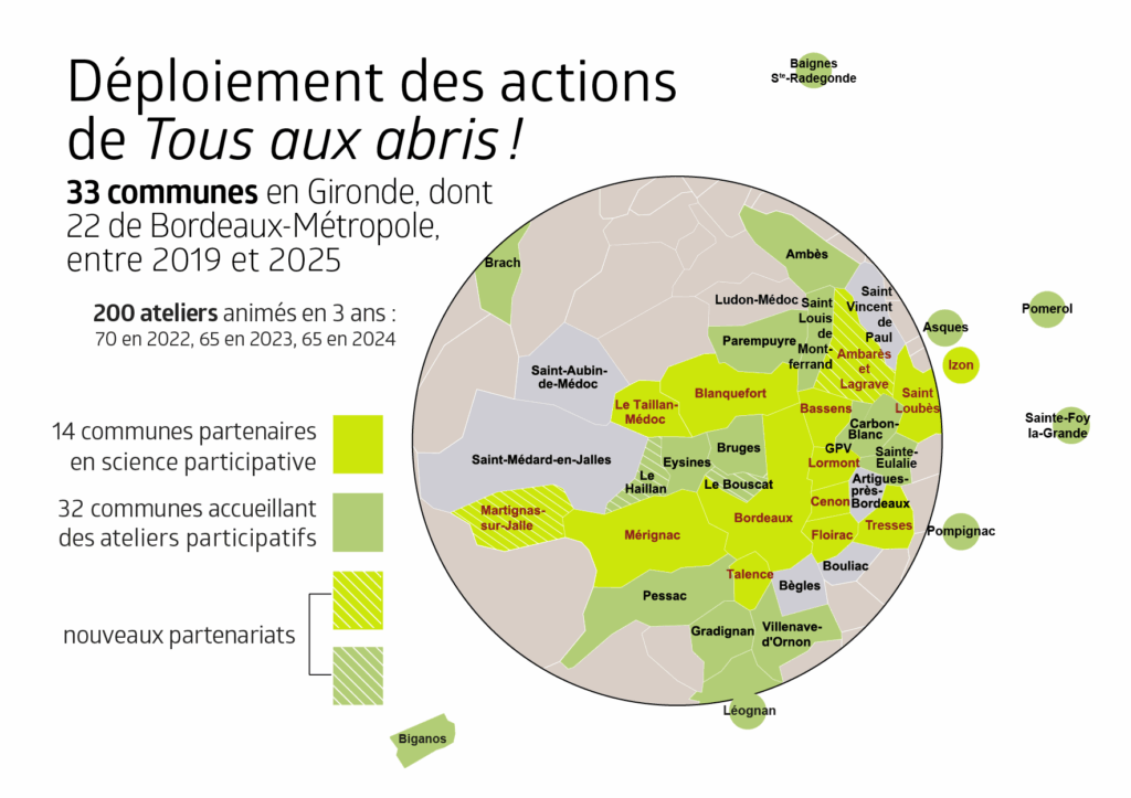 Majoritairement, nos ateliers participatifs sont des commandes de communes de Bordeaux-MĂ©tropole ou de l’aire de Bordeaux. Quelques-unes proviennent d’autres communes de Gironde, d’autres de dĂ©partements voisins (Nouvelle-Aquitaine). En 2025, nous proposons une gamme de près de 25 ateliers.